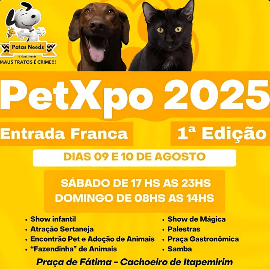 A cidade de Cachoeiro de Itapemirim vai sediar, nos dias 9 e 10 de agosto, a 1ª edição da PetXpo 2025, um evento gratuito voltado para toda a família e os amantes dos animais. A programação acontecerá na Praça de Fátima e promete reunir entretenimento, informação e ações de conscientização.