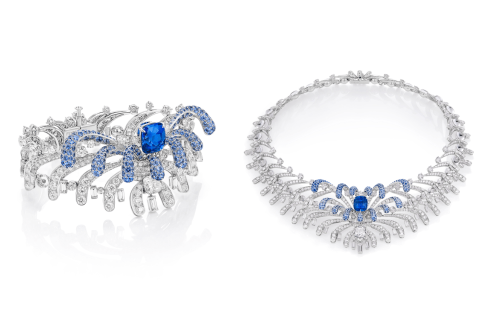 Como jatos d’água que caem em arcos delicados, diamantes brancos lapidados circundam a pedra central, pontuada por uma chuva cintilante de 100 diamantes amarelos lapidados em forma de pêra, um para cada ano da marca. Rubi, diamante, esmeralda e safira são algumas das pedras preciosas usadas nessa coleção.