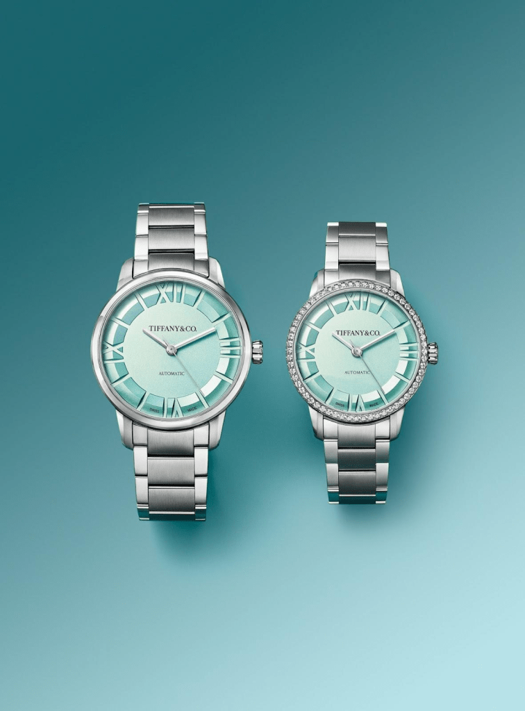 A nova coleção Atlas® é apresentada em três tamanhos: 29 mm, 34 mm e 38 mm, com mostrador Tiffany Blue® no menor tamanho e opção entre branco ou Tiffany Blue® nos maiores. Com um estilo limpo e contemporâneo, o mostrador apresenta algarismos romanos em destaque, índices minimalistas e ponteiros facetados com acabamento escovado e polido.